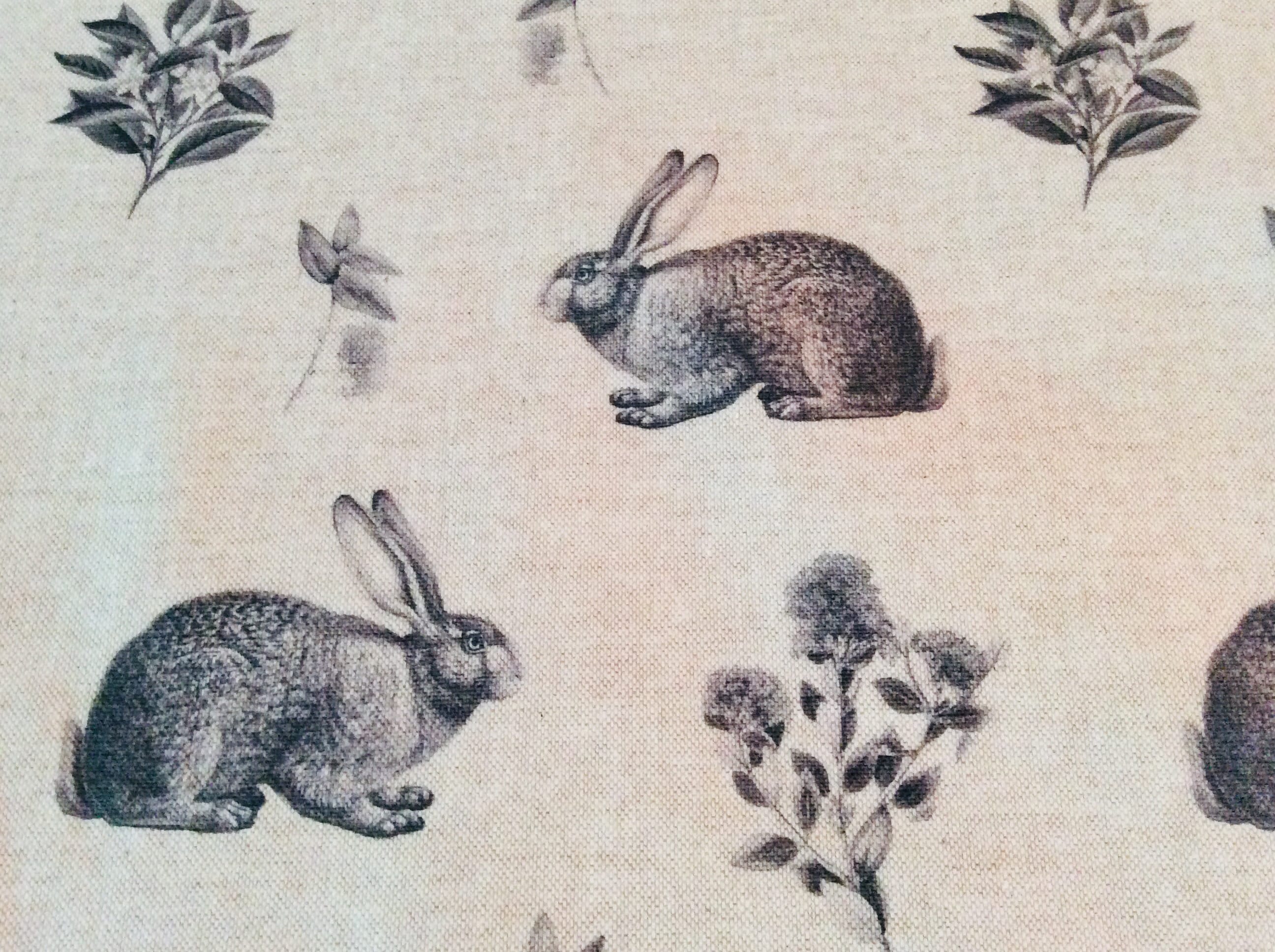 Natural linen backcloth with beautifully detailed Hares in charcoal and soft grey